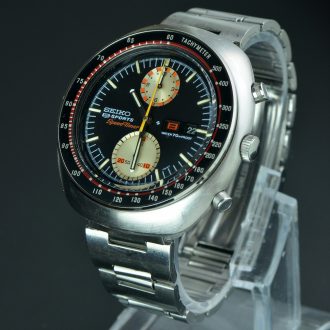 Der Klassiker – und wohl das meist gesuchte Modell der Seiko Chronographen aus den 70´ern. Die abgewinkelte Gehäuseform (Pultform) kombiniert mit den Drückern auf der Oberseite, verleiht der Uhr einen einzigartigen Look.