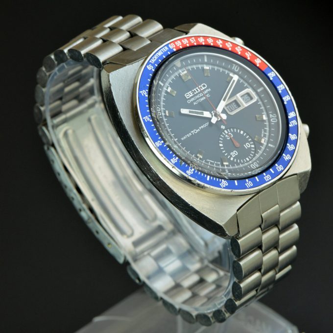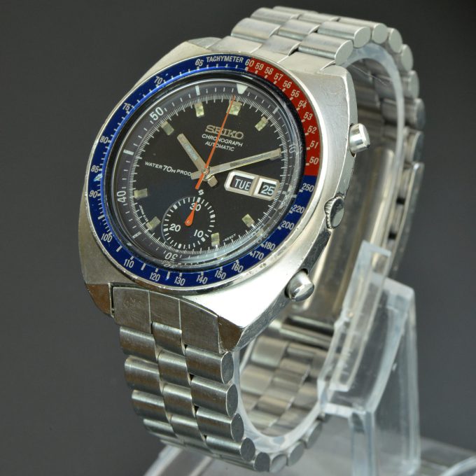 Ein Klassiker der Seiko Vintage Chronographen – benannt nach Col. Pogue der diese Uhr als persönlichen Gegenstand (allerdings die Variante mit goldfarbenem Zifferblatt) mit auf seine Weltraummission mitnahm.
